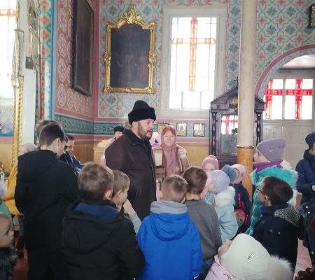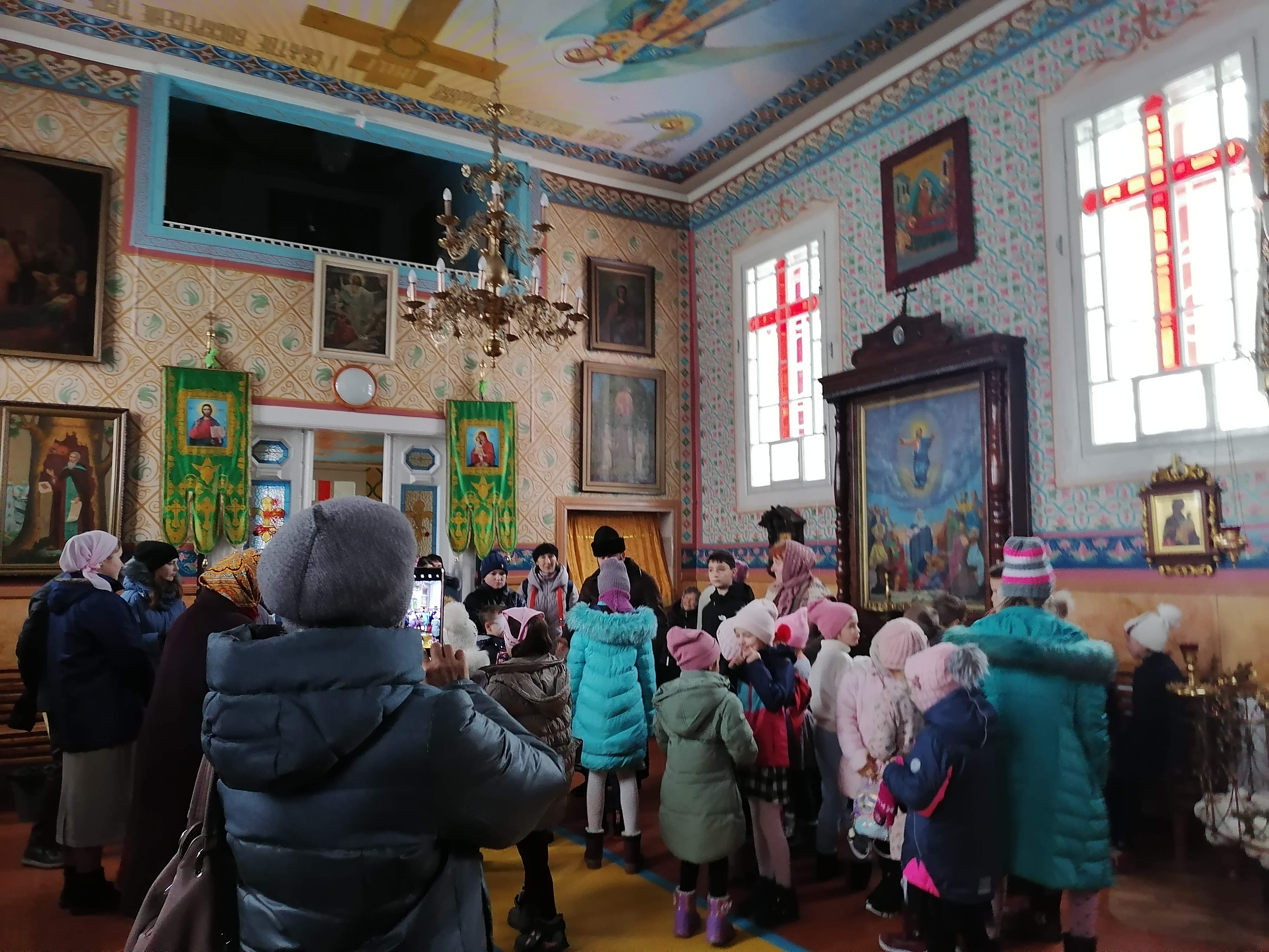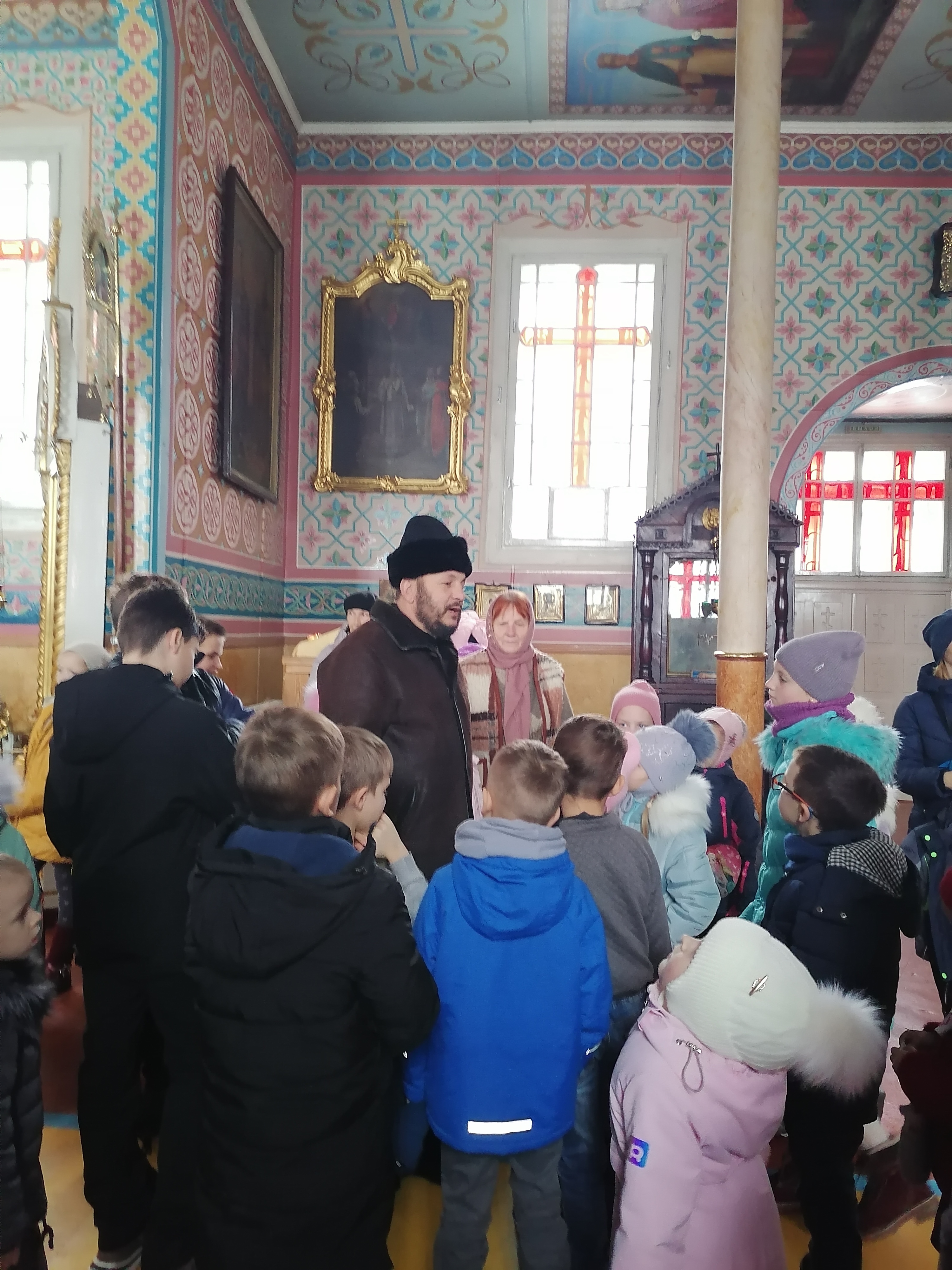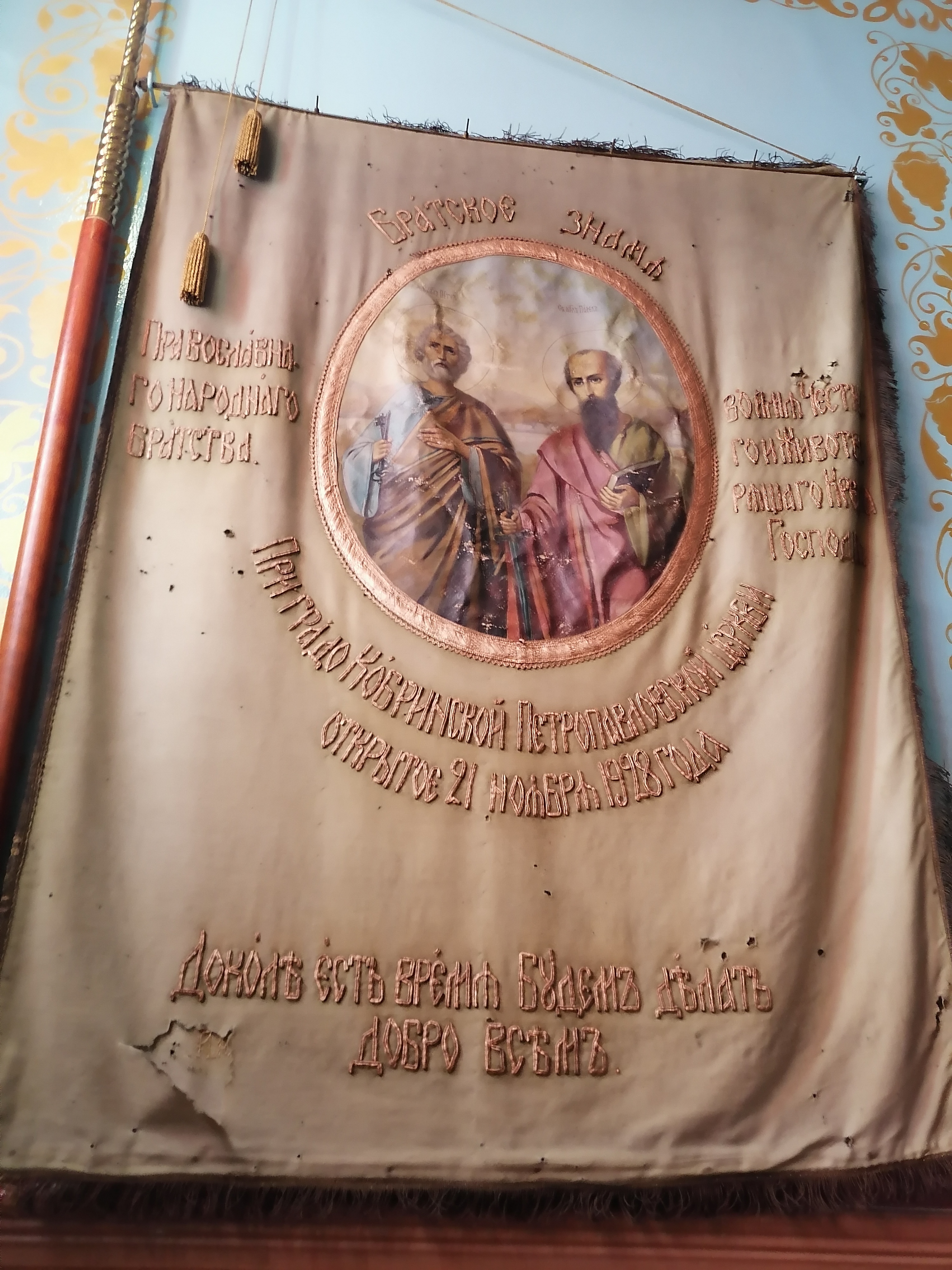 В исторических документах Петро-Павловская церковь Кобрина упоминается в 15 веке. Современное здание построено в середине 19 века. Иногда храм называют Суворовским. По преданию он молился в этом храме, бывая в Кобрине. Имя Суворова спасло храм от закрытия и разорения. Это единственный храм в Кобрине, службы в котором не прекращались ни на один день. Храм особенный. В нем бережно хранится Братское знамя, которому более 100 лет. Украшают храм иконы редкого письма, в том числе 10 образов на тему мук Христовых. Наше посещение храма совпало с экскурсией для воспитанников воскресной школы, которую проводил настоятель храма – протоиерей Александр. Беседа была интересна и душеполезна, как ребятишкам, активно вовлеченным в общение с батюшкой, так и нам. Одним словом, где просто - там ангелов со сто.