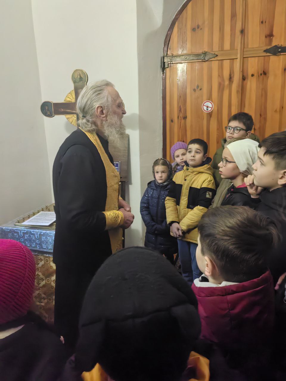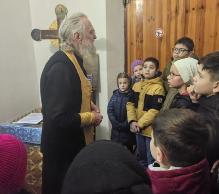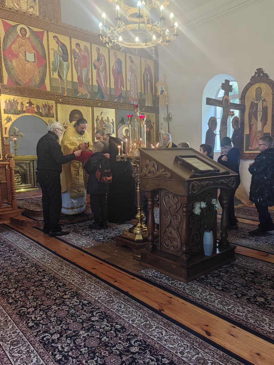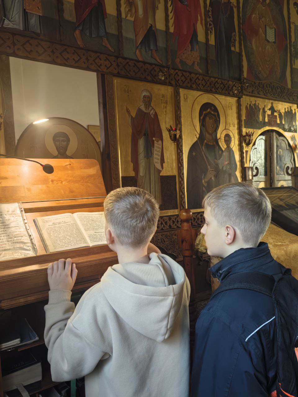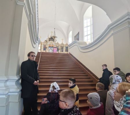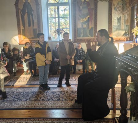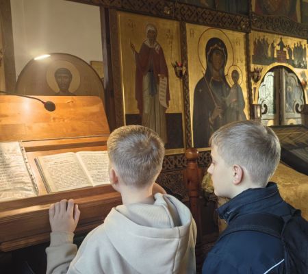 Наше небольшое путешествие началось с Божественной Литургии. Рано утром мы прибыли в деревню Великая Кракотка, где в таинственном каменном храме, расположенном на высоком холме среди живописных сосен, мы побывали на богослужении, помолились и причастились Святых Христовых Таин. В обители наших мальчиков пригласили почитать благодарственные молитвы по Святом Причащении. Желающих выполнить ответственное поручение перед чудотворным списком с иконы Божией Матери «Скоропослушница» было немало! После литургии, состоялась духовная беседа наших ребят с отцом Олегом на тему, что приносит людям Радость и желание жить.