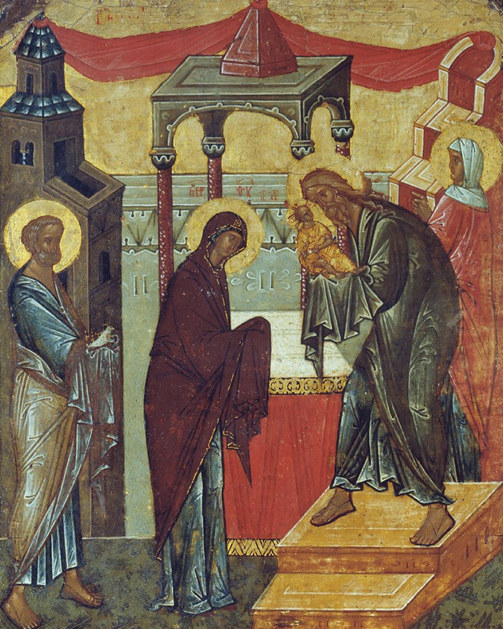 Младенец Христос был встречен при входе в храм благочестивым старцем Симеоном. Согласно Преданию Церкви, праведнику было обещано Духом Божиим, что он не умрет, пока не увидит своими глазами пришедшего на Землю Спасителя.